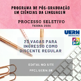 O Programa de Pós-Graduação em Ciências da Linguagem (PPCL) da Universidade do Estado do Rio Grande do Norte (Uern) está ofertando 23 vagas para alunos(as) regulares no Mestrado Acadêmico em Ciências da Linguagem.