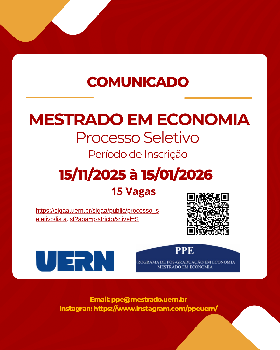 A Coordenação do Programa de Pós-Graduação em Economia (PPE), do Campus Central, da Universidade do Estado do Rio Grande do Norte (UERN), no uso de suas atribuições legais e regimentais, torna público, pelo presente Edital, o Processo Seletivo para preenchimento de 15 vagas de alunos regulares, turma 2026, com normas e procedimentos de inscrição e seleção de candidatos(as) para o Curso de Mestrado em Economia Aplicada.