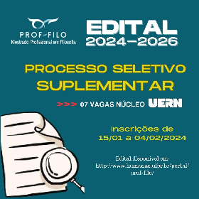 O Colegiado Geral do PROF-FILO - Mestrado Profissional em Filosofia torna público o presente edital que se destina a suplementar o processo seletivo de alunos/as para ingresso no período letivo 2024-2026 convocado pelo Edital Nº 006/2023 – PROF-FILO. Para o Núcleo Uern estão sendo ofertadas 07 vagas.